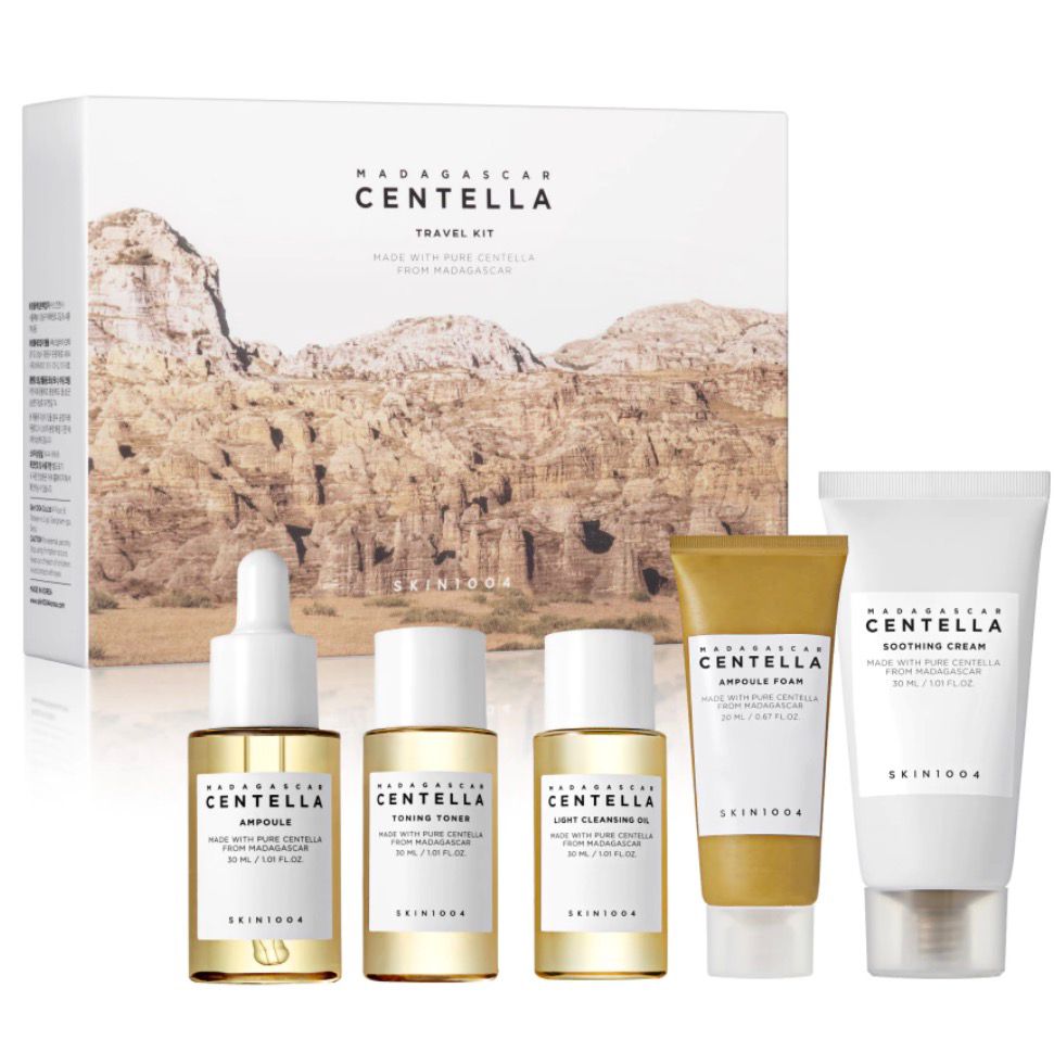 Kit com rotina completa de skincare calmante com Centella Asiática, ideal para limpar, hidratar, acalmar e fortalecer a pele.